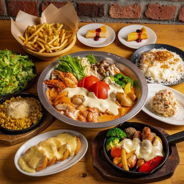海老とホタテのトマトクリームチーズ鍋/〆リゾット/燻製鮭のポテトサラダ/グリーンサラダ/チーズトースト/十勝ラクレットチーズ グリル野菜とソーセージ/ポテトフライ〈チーズ&ケーキ〉/とうもろこしのチーズ焼き/チーズケーキ〜ハスカップソース〜