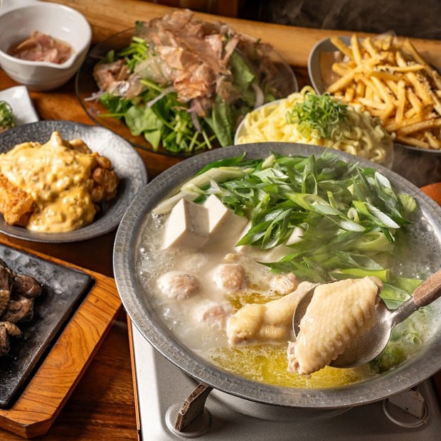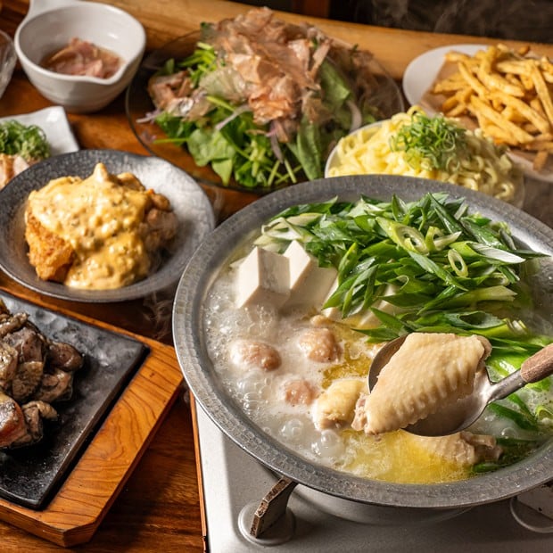 鶏屋の水炊き/地鶏むねみたたき 日向夏ポン酢/ほうれん草とベーコンのあったかサラダ/みやざき地頭鶏炭火焼き/若鶏のチキン南蛮/トリュフポテトフライ/〆のラーメン/ミニたい焼きアイス