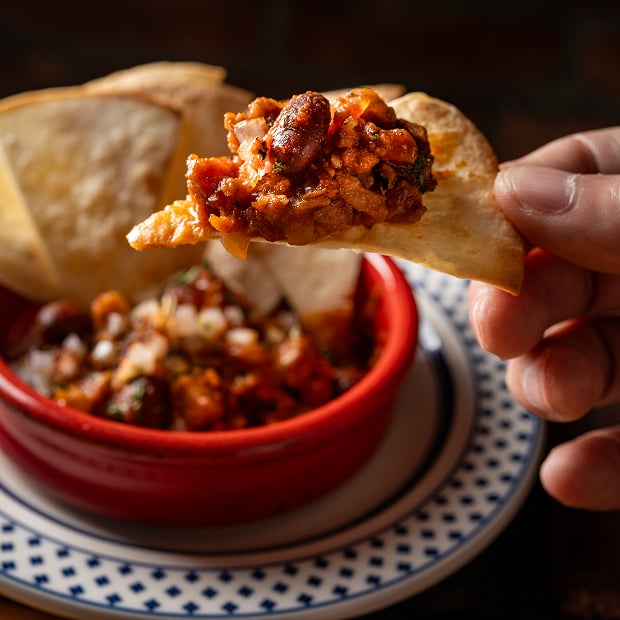 新得地鶏手羽元やもも肉、北海道産金時豆が入った特製チリコンカン。スパイシーでやみつきな味!トルティーヤチップスにたっぷりのせてどうぞ!