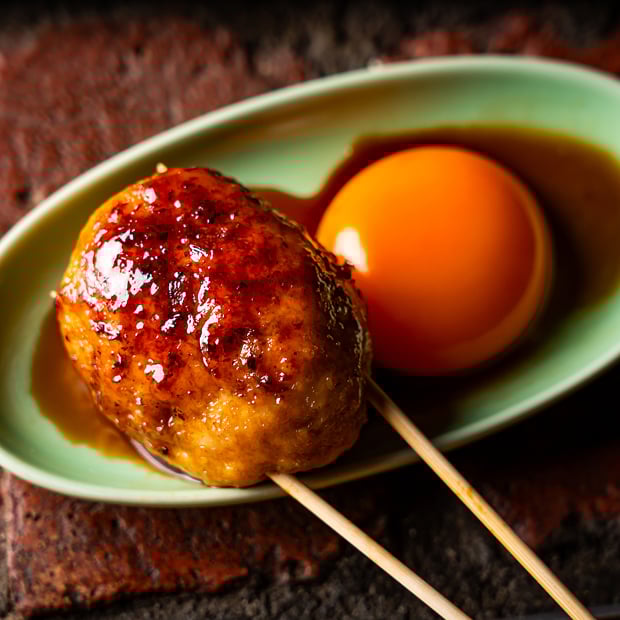 タレつくねを濃厚な卵黄にからめてどうぞ!