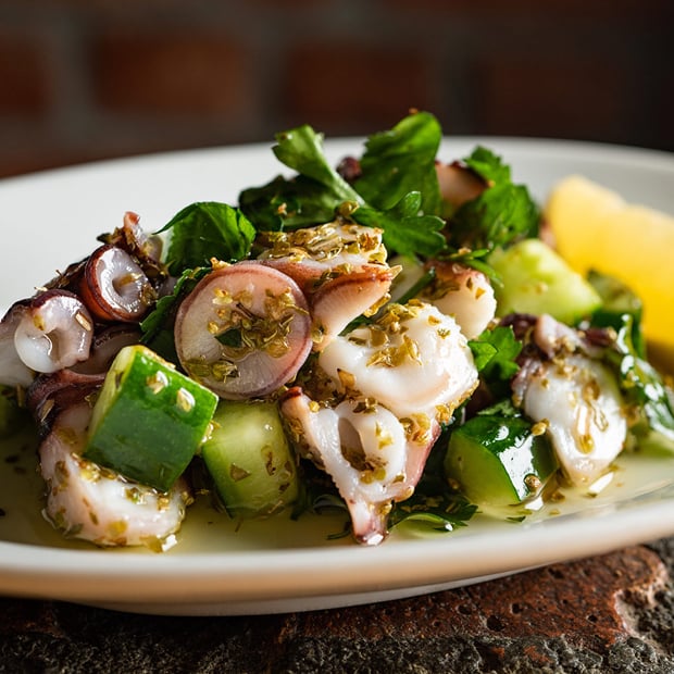 北海道産の水たこを、オレガノとイタリアンパセリの香りと出汁を効かせた塩でマリネしました。