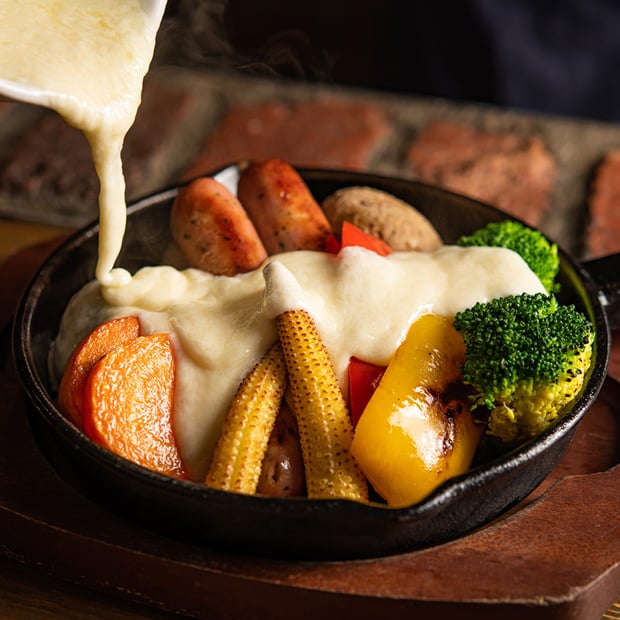 彩り豊かなグリル野菜とソーセージに相性抜群なラクレットチーズをたっぷり絡めてお召し上がりください!