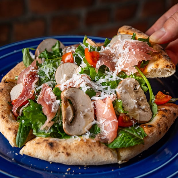 十勝にある『minori pizza』と共同開発した特製とかちピザ!とかちマッシュや北海道産生ハム、十勝チーズが入ったフレッシュなピザです。