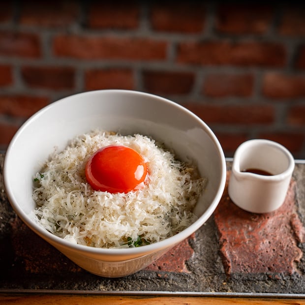 十勝産の塩漬けしたラクレットチーズがたっぷりかかった玉子かけごはんです。チーズの濃厚さと鮭節や鮭醤油の旨味が加わったオリジナルTKG!