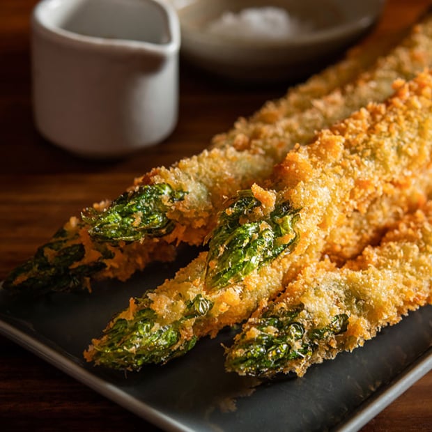 旬のアスパラは甘くて太くてホロホロです。サクサクのフライをソースまたはオホーツクの塩でどうぞ!※7/14まで