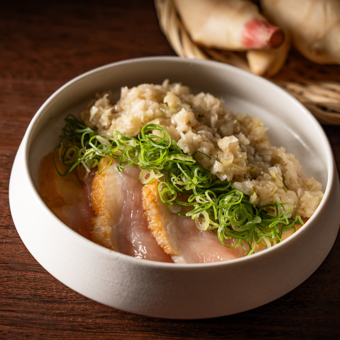 地鶏むねみたたきの秋限定の味わいは、鹿児島県産の「霧島ジンジャー」をたっぷり使用した新生姜葱ダレ。食感を残した霧島ジンジャーは、新生姜ならでは爽やかな香りとスッキリした優しい絡みが特長。もっちりしたむね肉にたっぷり乗せてお楽しみください。