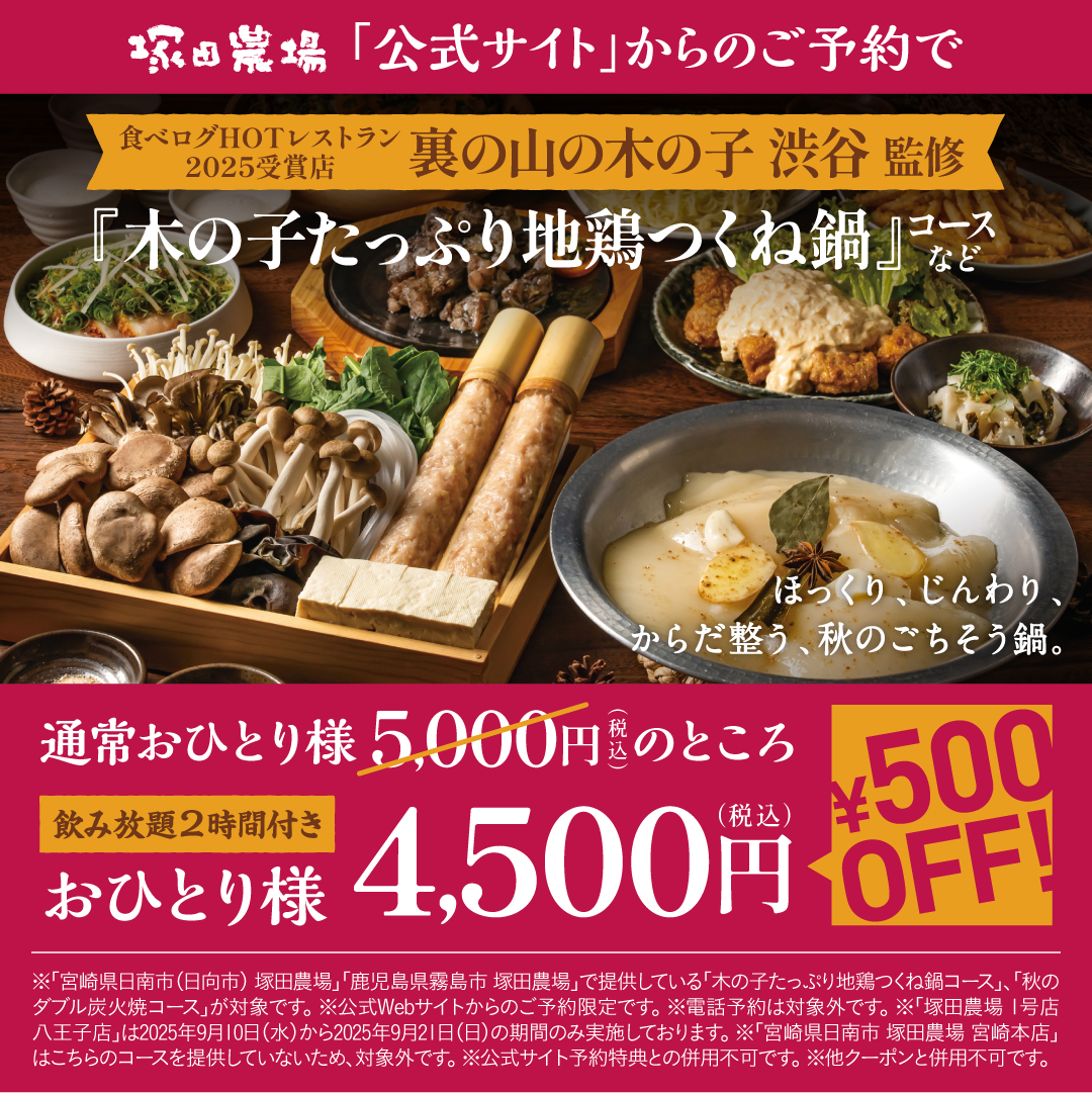 秋の宴会コースの中でもこちらの「木の子たっぷり地鶏つくね鍋コース」「秋のダブル炭火焼コース」は、塚田農場公式ページからのご予約で、お一人様につき500円オフとなります。ぜひ、この機会にお試しください。