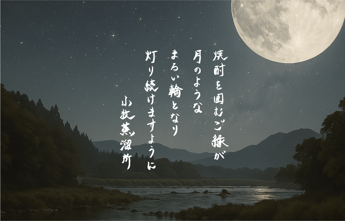 小牧醸造が位置する鹿児島県・さつま町の夜空、蔵の横をながれる川内川(せんだいがわ)に浮かぶ満月の景色とともに、小牧醸造代表の小牧一徳さんの直筆メッセージを添えています。